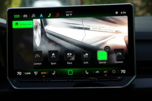 A “Special” Nurburgring drive mode softens dampers and optimizes torque vectoring. Touch the steering wheel’s left-spoke R spot and the infotainment screen pulls up drive mode tiles. Tap “Race.” This opens Special and Drift options. A Harman Kardon 480-watt, nine speaker, 12-channel amp plays your own tunes.