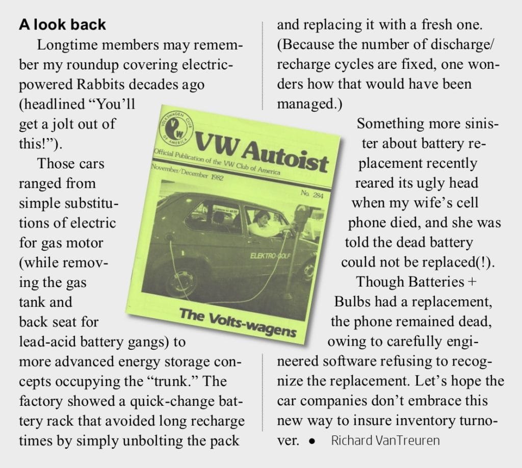 I have nothing against a battery powered option. I was excited as anyone when VW’s lineup was to include gas, diesel, GTI and e-Golfs. Remember the fellow who brought his electric Beetle to one of our VWCA conventions up north? His handiwork had produced street-savvy transportation from a gaggle of Walmart batteries, a DC motor and controller rigged to what had been the gas pedal.
