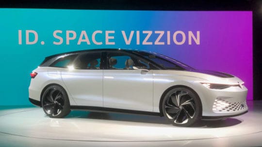 Los Angeles: Volkswagen introduced its ID. Space Vizzon electric concept. It’s an aerodynamic vehicle built on the firm’s MEB modular electric-drive matrix. The slippery shape extends its range. The battery, integrated into the vehicle’s floor, supplies power to a rear-mounted 275-hp motor. This spins the rear wheels for about 300 miles on a charge.