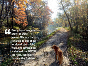 I committed myself to making sure that every day Ella had left was a good day. For the first few months, she seemed perfectly healthy and happy. As the days got warmer, sometimes we’d arrive at the park for a walk and she’d only wander a short distance before wanting to go back to the Bus. On those days, we’d spend time driving instead of walking, making short visits to two or three different parks for a short stroll at each. The months rolled on, and Ella rolled with them, defying the prognosis. Some days we fooled ourselves into thinking that after all she’d been through, somehow, she’d beat this thing. Of course, that was wishful thinking.