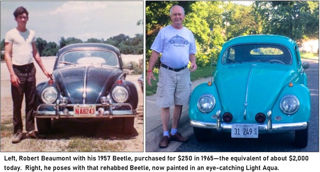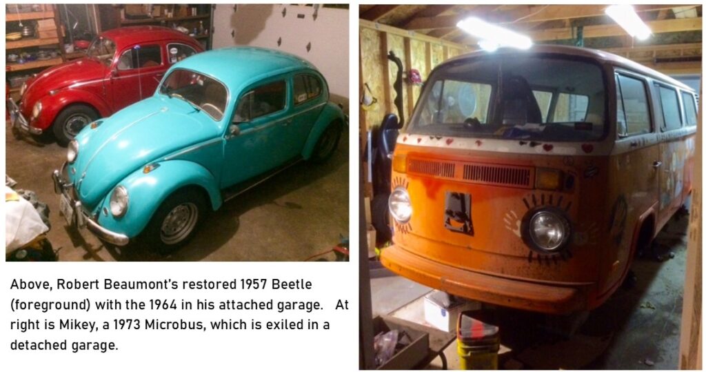 I drive my ’64 several thousand miles in a typical year after commuting in it for most of my Postal Service career. It’s logged more than 384,000 miles. I’ve only driven the ’57 a few hundred miles in the last couple of years because I’m still debugging the car. Overall, it’s traveled “only” about 182,000 miles. My winter car is a 2003 New Beetle.