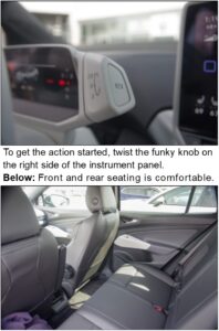 VW smothers lower sections of the dash and the center console in hard plastics. But VW scooped out pillar covers for added elbow room in back. Two whimsical pedals: the long one has a forward icon on it, while the slow one has a pause icon to begin your drive. With the fob inside the cabin, just press the “pause” pedal and the ID is ready. Next, you twirl a funky knob on the right side of the instrument housing. Clockwise enables drive, do that again and you select regenerative braking, which commences almost one-pedal driving. Reverse is counter-clockwise and you press the knob inward for park. Releasing the forward pedal in standard drive mode imparts the same coasting sensation as gas-fueled VW with an automatic transmission.