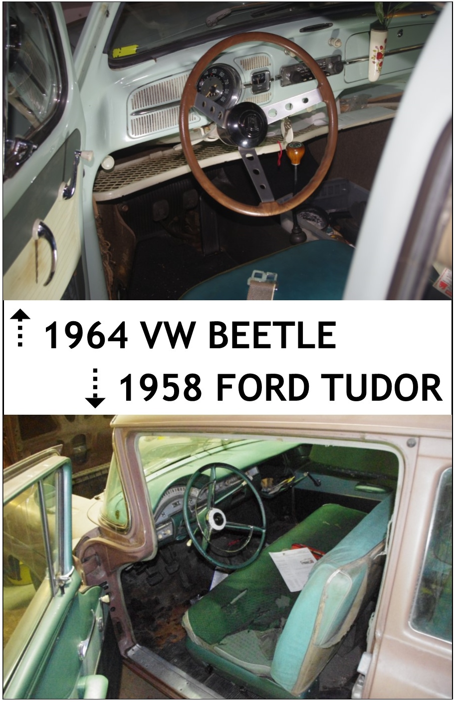 The Ford’s more flamboyant; the Beetle more business-like. There’s more rug in the Beetle as the Ford uses faux carpet molded rubber-like flooring, whereas the Bug has grooved rubber mats with bound charcoal carpet trimming on the kick panels. The Ford’s got cardboard-like materials under the dash. The Beetle is very tidy under the metal dashboard, whereas the Ford is a festival of uncovered nasty bits but has a padded dash cover and plenty of instruments.