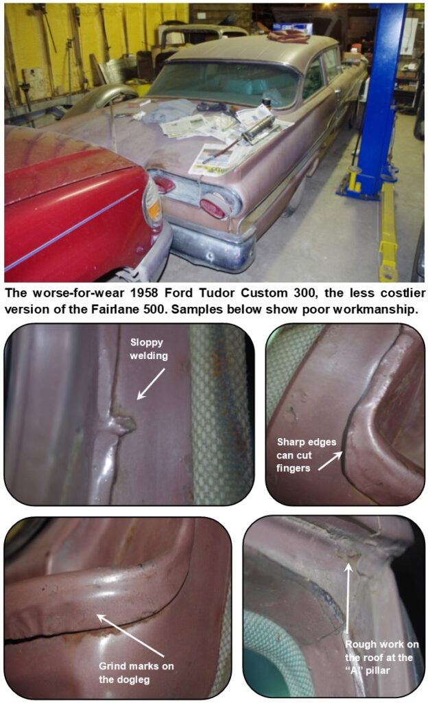 Don’t look too closely at the Ford or dare to caress it without split-leather work gloves. There are lots of grinder gouges and filing hashes plus plenty of sharp spot welds or spatter surrounding the front doors from top to bottom. And the body wavers where pillars attach or on the catwalks. It appears they rushed this one out of the factory with little thought that length alone didn’t make a quality car. Ford’s fine family of vehicles wasn’t for discerning families.