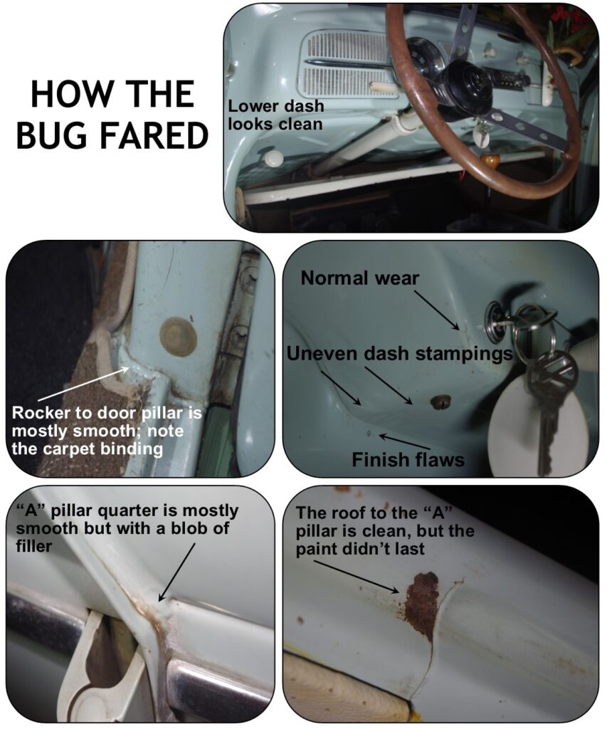 The VW in contrast has fewer obvious mistakes. Yet, it’s not as perfect as those famous ads promised. The “A” pillar is smoothly shaped and richly coated. Rocker panels are likewise smooth. Most welds are neatly completed, although you’ll see some unwanted crud under the paint near the door pillar. And the door’s weather-stripping abraded the transition from roof panel to pillar. The biggest gaff is ahead of the ignition switch. There is a bubbled area where the dashboard meets the abutting panel. Clearly all those inspectors who signed off on that Beetle’s exterior in the famous ad, where blindfolded — not pegging an obvious blemish. The transition from front quarter panel to “A” pillar isn’t blotch free either.