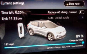 VW recommends an 80% charge level for everyday driving, with a minimum level of 20% in mild weather, 40% in cold weather. Charging stations must be SAE J1772-compatible, which includes a rapid charge connector called CCS — combined charging system. The car communicates and charges via these wires. In the USA, you’ll find several kinds of charging connections. Tesla’s is different from the J1772 used on most other vehicles. Using an adapter, you can plug your VW into a Tesla charger — but not the Supercharger type.