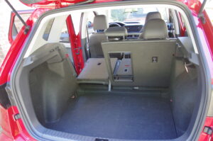VW doesn’t coat the cargo bay’s metal bits with much of the optional ($395) King’s Red Metallic color coat. Items such as cargo hooks look like primer. There’s a spare tire and toolkit. The liftgate has only one interior pull down handle. Closing it requires muscles.