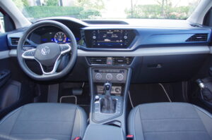 Inside, Taos’ plastic-shell dash pad and imitation blued-metal dashboard fascia scream cheap. It’s not a total loss. Under this you’ll find a soft touch ridge —much like a 1974 Karmann Ghia’s. VW doesn’t extend this softer side to the console — which caused my leg hairs to get staticy near the hard plastic.