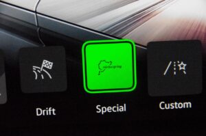 There is a blast of sorts: finger-dialed chassis/engine drive modes. These settings make driving, as with painting therapy, pleasurable. May I direct you to the blue R logo on the steering wheel’s left side? Rub it. Then, the touchscreen’s drive mode menu expands: race, drift (serious tire painting), sport, comfort and individual. Want Eco? Sorry Charlie, this isn’t your auto. The R, however, prompts you when to shift or coast for best fuel economy.