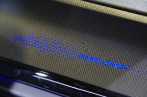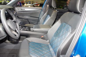 Since the Atlas has 6% of theAmerican midsize SUV segment (450,000 sold to date), VW spent money on upscale interior aiming to become the brand’s pinnacle crossover. The shift-by-wire transmission control lever, means there’s a pass-thru cubby between the front seats. Quilted double-stitched seat covers add a bespoke touch. There’s ambient LED interior lighting with a lighting signature in the Cross Sport’s carbon-fiber look right dash panel.