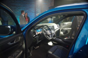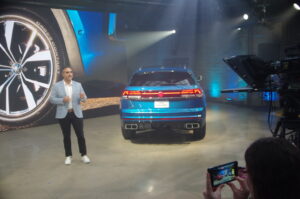 Di Si, touts a number of Atlas upgrades meant to improve customer satisfaction and retention. The first item is a new 269-hp, 2.0-liter turbocharged four-cylinder engine with 273 lb-ft of torque. Twist is up 28% compared with the departing V-6. He says customers want more urgency when they step on the go pedal. Now, they’ll get it. Another update is a softer, more luxurious interior. You’ll find stitched leatherette on the dashboard with LED ambient lighting. Quilted seating apes a Bentley.