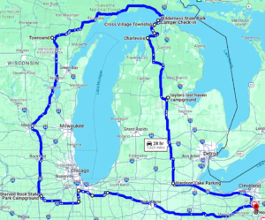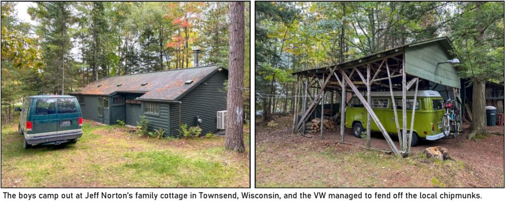 With many spare parts and tools hidden in nooks and crannies in the Bus, our trip began on beautiful, warm, sunny Friday, Sept. 22, 2023. We planned it as a full day of driving to set us up for lower-mileage days during the middle of the trip. Jeff left from Cincinnati and I from Canton, and within a few hours we met at Harrison Lake State Park just north of the Ohio Turnpike (I-90), about 50 miles west of Toledo, Ohio.