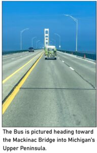 We found our way back to the campsite, had lunch, packed up and began the next leg of our journey: 250 miles around the top of Lake Michigan to Jeff’s family cottage on Bass Lake in Townsend, Wisconsin. The highlight of that journey was crossing the Mackinac Bridge into Michigan’s Upper Peninsula. Despite the stiff breeze from the northeast requiring me to crank the steering wheel about 45 degrees to the right to maintain a straight course, the Bus confidently traversed all 26,372 feet of the bridge, unlike the Yugo that plunged off the bridge and into the Straits of Mackinac during high winds in 1989.