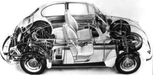 The car acquired a new identity Stateside that it didn’t possess in its homeland. In Germany the car was ubiquitous — a solidly middle-class Volkswagen, representing automotive normalcy, a step up from bubble cars. In contrast, Americans saw an unusual car, which they dubbed the Beetle or Bug. Its technical features, size and shape set it apart from orthodox American vehicles.