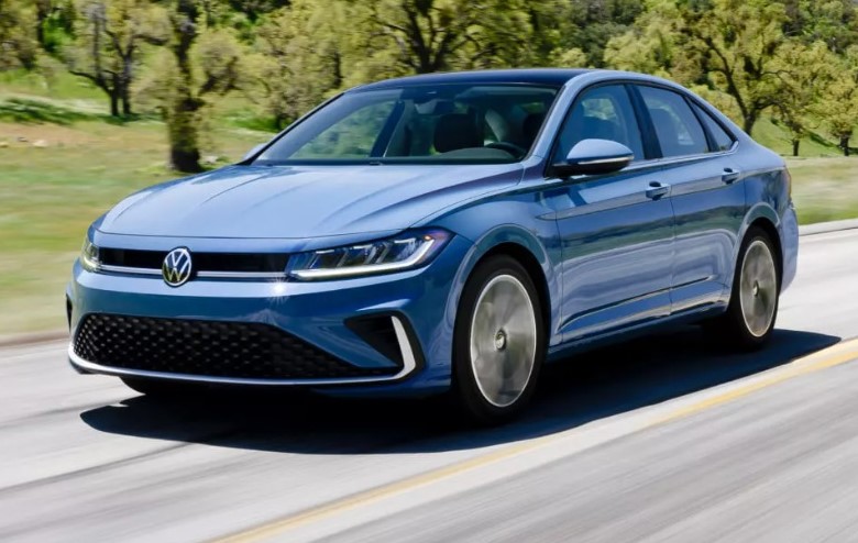 VW’s refreshed 2025 Jetta wears new hues, new wheel designs, grille/headlight rhinoplasty and a reconfigured rump. Under the hood, there’s a 1.5-liter turbocharged four-cylinder mill (158-hp). It now mates faithfully, no manual, to conventional eight-speed automatic.