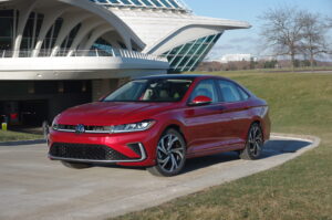 VW’s refreshed 2025 Jetta wears new hues, new wheel designs, grille/headlight rhinoplasty and a reconfigured rump. Under the hood, there’s a 1.5-liter turbocharged four-cylinder mill (158-hp). It now mates faithfully, no manual, to conventional eight-speed automatic.