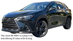 The Lexus NX rides on the Toyota RAV4’s setup. The 450h+ I drove is the plug-in hybrid version. If you plug it in, say, every day, you might EV it for 37 miles never knowing that when the engine kicks in, it’s a noisy beast. Also its EV range lost about three miles during my highway trek.