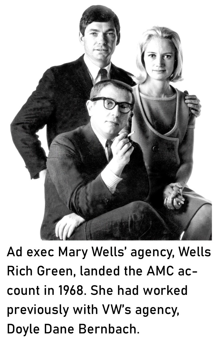 Jan Norbye, Popular Science’s automotive expert, blasted Rambler’s 1966 lineup for not installing swaybars, using inferior brakes and having dated torque-tube drives. Its Borg Warner automatic transmissions were tagged for rough shifting and lousy downshifts — or, as C&D noted, it took all of 10 seconds for the kickdown to be felt. It’s as if AMC put its resources into manufacturing a new image — see Mary Wells (former Doyle Dane Bernbach adwoman — right, VW’s agency), whose firm, Wells Rich Greene, landed the AMC account for 1968. AMC fancied itself as battling the Big Three on their turf when others, Toyota/VW, say, catered to the growing demand for subcompacts.