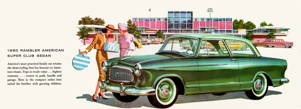 Yet, as with VW’s True Volkswagen heritage kick, postwar Nash and later, after it merged with Hudson to form AM, often went back to inform its future. For 1950, it dusted off an old nameplate, Rambler, and applied it to its bulbous two-door 100-inch wheelbase compact car line, which eventually added a 108-inch wheelbase four-door. Then, it discontinued that model and replaced it with a freshly-styled 108-inch wheelbase Rambler in 1956, an intermediate.