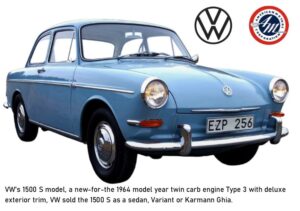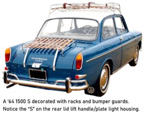 The 1500 S (for “Special”) had a dual carburetor engine with much more power than the earliest 1500 models. Also, and significantly, VW dressed up the exterior with front lid chrome and bright metal side trim. Note that the C&D cover story shows a normal (plain Jane), not S model Type 3, without the deluxe bright trim.