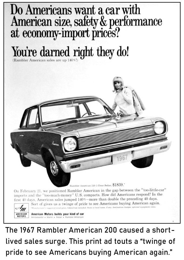 Surprisingly, despite AMC’s image makeover, it was the budget-priced import-fighting Rambler American 220 of 1967 that caused a short-lived sales stir. AMC couldn’t pump out enough of these Americans, but because AMC cut the dealer markup to lower the MSRP, the buyers expecting typical American-car discounts couldn’t get them.