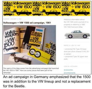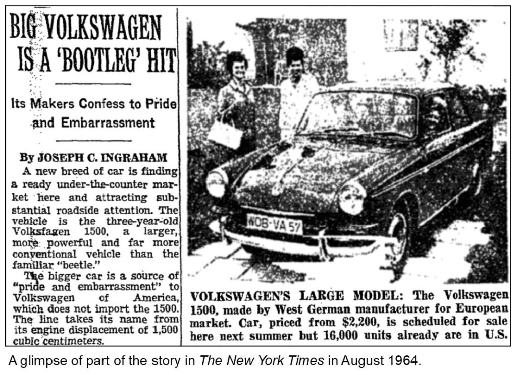 The New York Times (Aug. 16, 1964) described the bigger Volkswagen as a “bootleg hit.” Newsweek (Sept. 7, 1964) said “the VW 1500, like its snub-nosed model 1200 … seems to be inspiring Wagnerian emotion.” It claimed an estimated 16,000 “status-loaded collector’s items among American Volkswagen … fans have rolled in under the rug with buyers paying scalpers up to $1,700 above European book value” — nearly $18,000 in today’s currency.