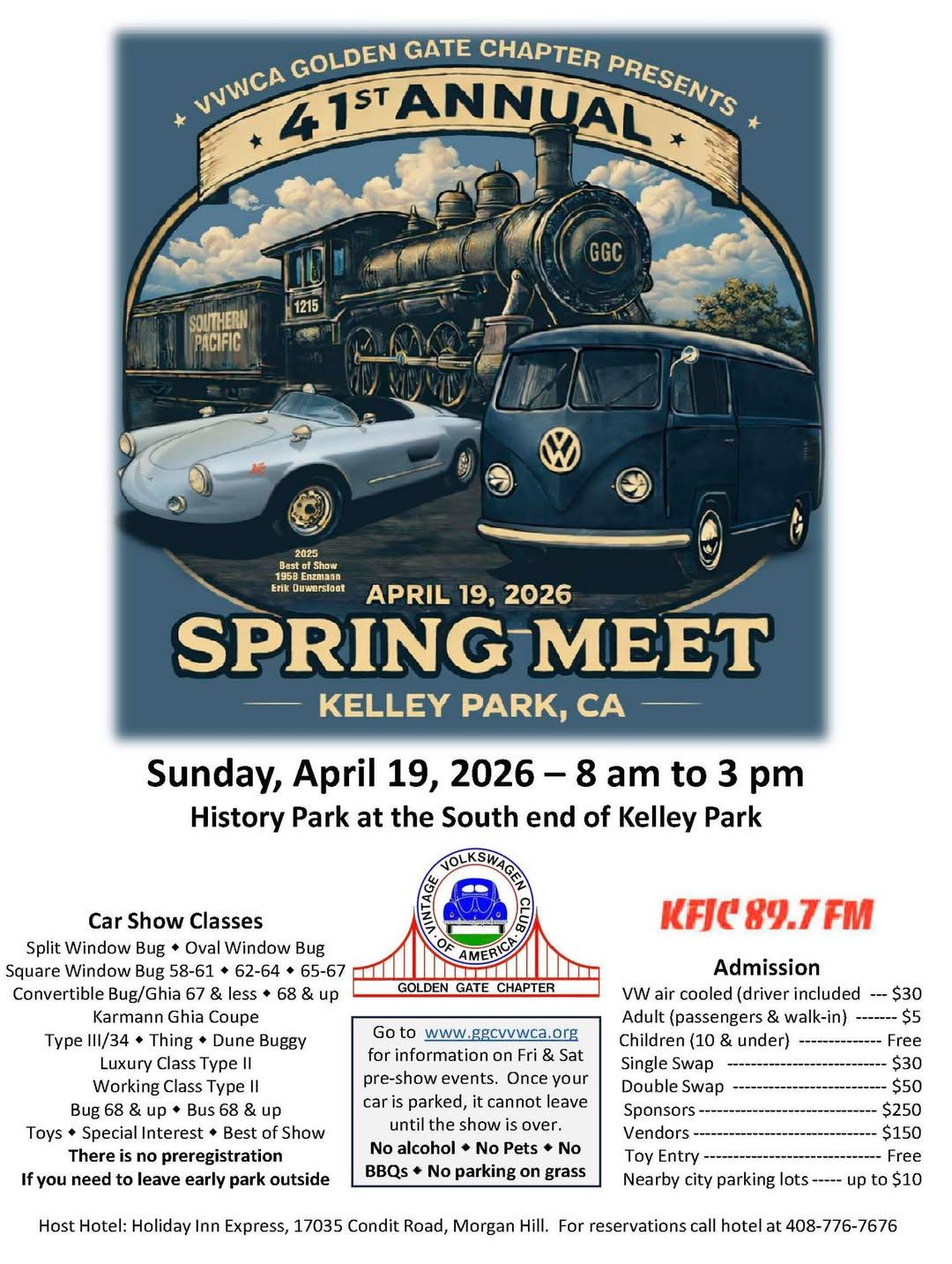 The Golden Gate Chapter of the Vintage Volkswagen Club of America will be hosting their 41st Annual Spring Meet at History San Jose at Kelley Park in San Jose CA on Sunday, April 19 from 8 am to 3 pm. All air-cooled VW’s are welcome. All cars entering the park MUST register for the car show and MUST park in their respective class. There will be NO pre-registration for either the car show or swap. You will queue up in the bottom parking lot and pay at the gate and register your car at the club booth after you park your car inside the park. Because of park concerns with people leaving early in their cars before the show ends, we ask if you think you have to leave early that you please park your car outside and walk-in. Download this flyer for Show Classes and Admission Fees. For latest details and information on Friday & Saturday pre-show events, visit www.ggcvvwca.org.